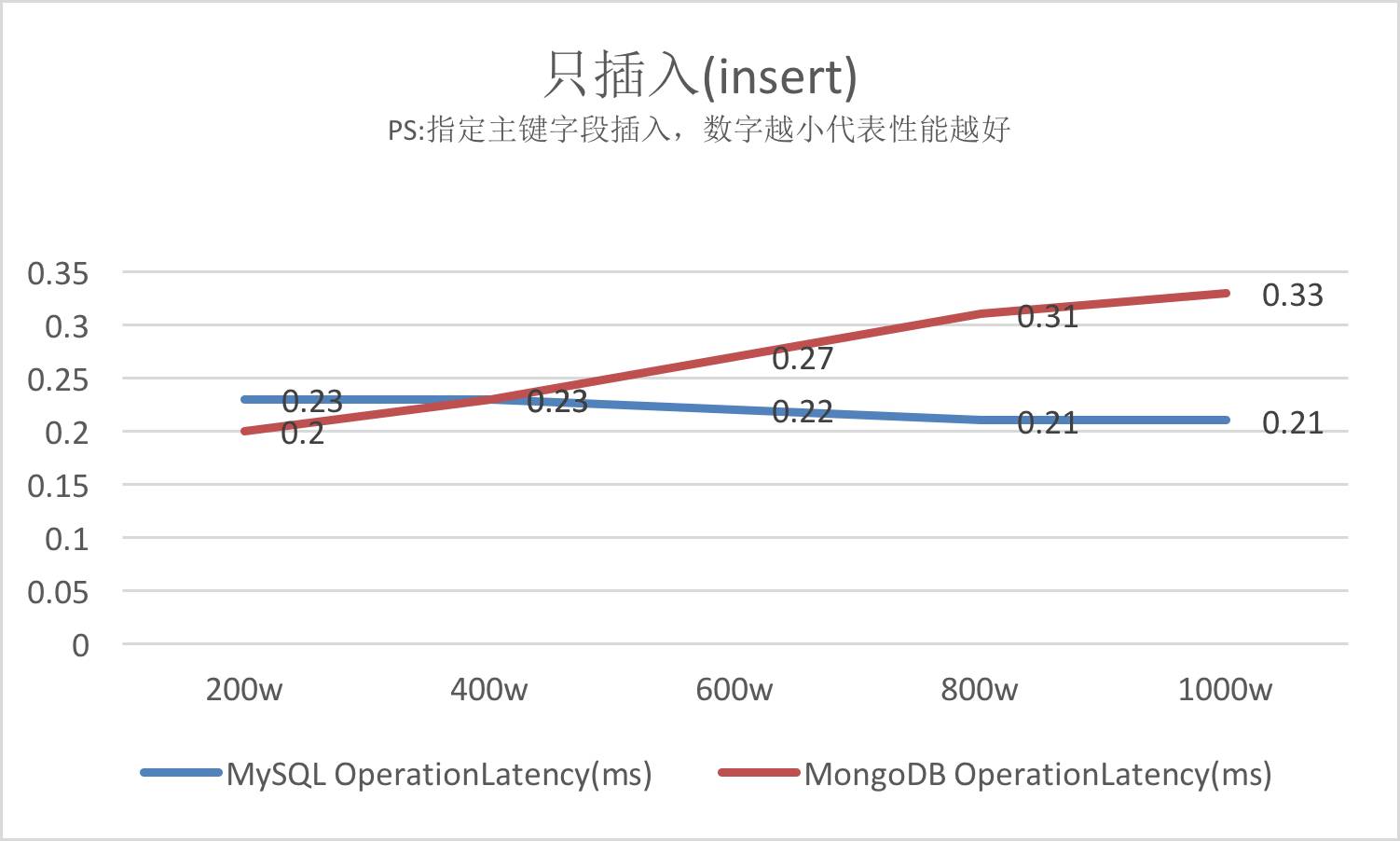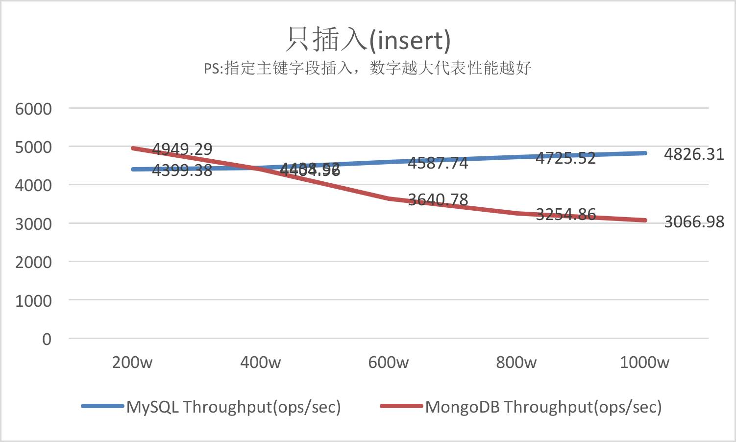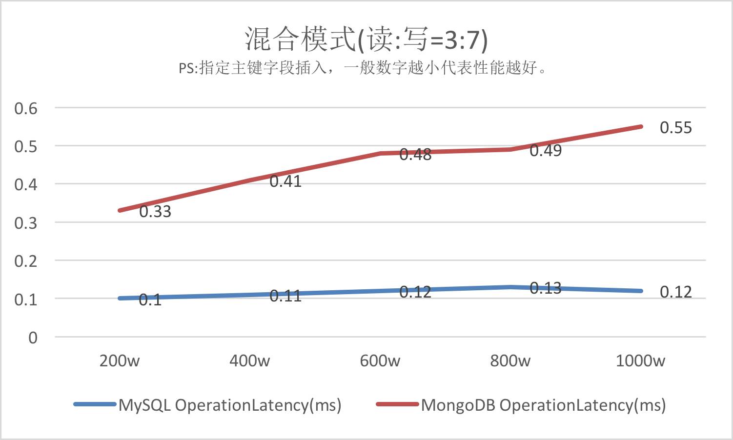 (5) 稳定性方面,MongoDB不如MySQL,MySQL不愧是一种非常稳定的数据库,无论在指定主键还是在不指定主键插入的情况下,其效率都差不了太多, 其稳定性还是毋庸置疑。