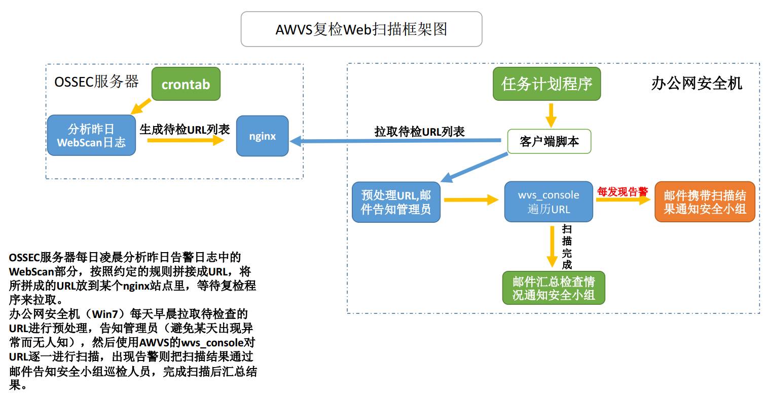 OSSEC服务器每天凌晨定时分析前一天的web扫描日志,按照约定的格式拼接出URL列表,而办公网安全机(win7)则每天早晨拉取待复核的URL进行预处理后丢到队列里,然后调用wvs_console对URL逐一进行扫描,出现告警则把扫描结果通过邮件发送给安全巡检人员进行通知;未发现异常则发汇总邮件进行闭环,确保当天的复核是确实进行过的。