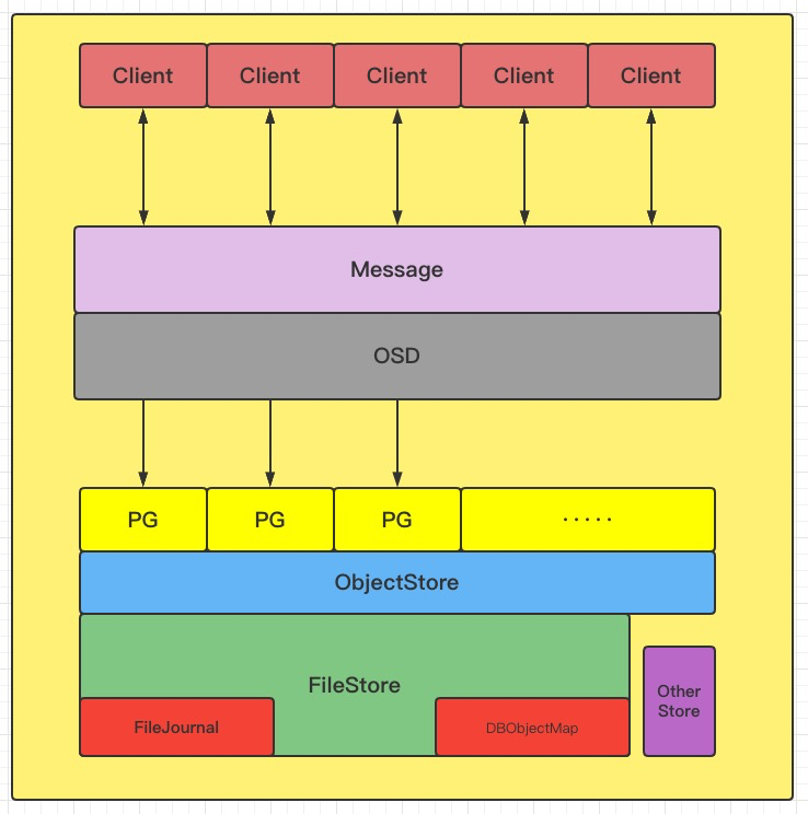 ObjectStore是Ceph OSD中最重要的概念之一,它封装了所有对底层存储的IO操作。从上图中可以看到所有IO请求在Clieng端发出,在Message层统一解析后会被OSD层分发到各个PG,每个PG都拥有一个队列,一个线程池会对每个队列进行处理。