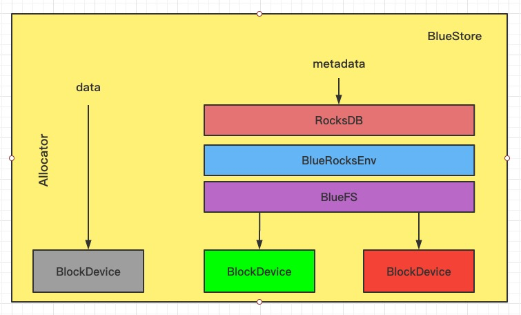 BlueFS和BlueStore可以共享裸设备,也可以分别指定不同的设备,比如为了获得更好的性能Bluestore可以采用 SATA SSD 盘,BlueFS采用 NVMe SSD 盘。