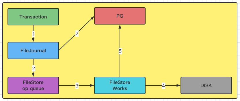 从架构图我们可以看出来几个重要的组件:FileJournal、omap、XFS、DISK。我们来解读一个存储的流程是怎样的。