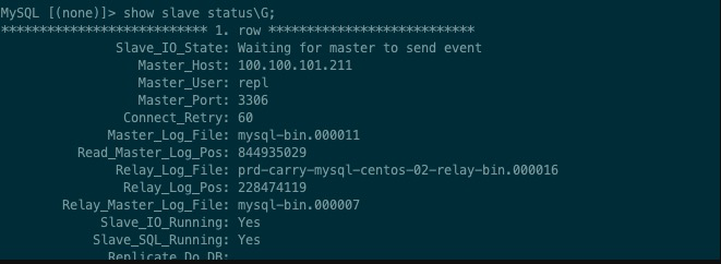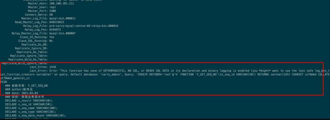 MySQL [(none)]> show slave status\G;*************************** 1. row ***************************Slave_IO_State: Waiting for master to send eventMaster_Host: 100.100.101.211Master_User: replMaster_Port: 3306Connect_Retry: 60Master_Log_File: mysql-bin.000011Read_Master_Log_Pos: 840319815Relay_Log_File: prd-carry-mysql-centos-02-relay-bin.000016Relay_Log_Pos: 6594972Relay_Master_Log_File: mysql-bin.000007Slave_IO_Running: YesSlave_SQL_Running: NoReplicate_Do_DB:Replicate_Ignore_DB:Replicate_Do_Table:Replicate_Ignore_Table:Replicate_Wild_Do_Table:Replicate_Wild_Ignore_Table:Last_Errno: 1418Last_Error: Error 'This function has none of DETERMINISTIC, NO SQL, or READS SQL DATA in its declaration and binary logging is enabled (you *might* want to use the less safe log_bin_trust_function_creators variable)' on query. Default database: 'carry_admin'. Query: 'CREATE DEFINER=`root`@`%` FUNCTION `F_GET_SEQ_NO`(in_seq_id VARCHAR(50)) RETURNS varchar(255) CHARSET utf8mb4 COLLATE utf8mb4_general_ciBEGINSkip_Counter: 0Exec_Master_Log_Pos: 6594757Relay_Log_Space: 3465214023Until_Condition: NoneUntil_Log_File:Until_Log_Pos: 0Master_SSL_Allowed: NoMaster_SSL_CA_File:Master_SSL_CA_Path:Master_SSL_Cert:Master_SSL_Cipher:Master_SSL_Key:Seconds_Behind_Master: NULLMaster_SSL_Verify_Server_Cert: NoLast_IO_Errno: 0Last_IO_Error:Last_SQL_Errno: 1418Last_SQL_Error: Error 'This function has none of DETERMINISTIC, NO SQL, or READS SQL DATA in its declaration and binary logging is enabled (you *might* want to use the less safe log_bin_trust_function_creators variable)' on query. Default database: 'carry_admin'. Query: 'CREATE DEFINER=`root`@`%` FUNCTION `F_GET_SEQ_NO`(in_seq_id VARCHAR(50)) RETURNS varchar(255) CHARSET utf8mb4 COLLATE utf8mb4_general_ciBEGINReplicate_Ignore_Server_Ids:Master_Server_Id: 1Master_UUID: ab09d6b7-7cb5-11eb-942e-fefcfea23161Master_Info_File: mysql.slave_master_infoSQL_Delay: 0SQL_Remaining_Delay: NULLSlave_SQL_Running_State:Master_Retry_Count: 86400Master_Bind:Last_IO_Error_Timestamp:Last_SQL_Error_Timestamp: 210310 22:58:38Master_SSL_Crl:Master_SSL_Crlpath:Retrieved_Gtid_Set:Executed_Gtid_Set:Auto_Position: 0Replicate_Rewrite_DB:Channel_Name:Master_TLS_Version:Master_public_key_path:Get_master_public_key: 0Network_Namespace:1 row in set, 1 warning (0.00 sec)ERROR:No query specified