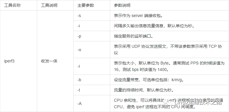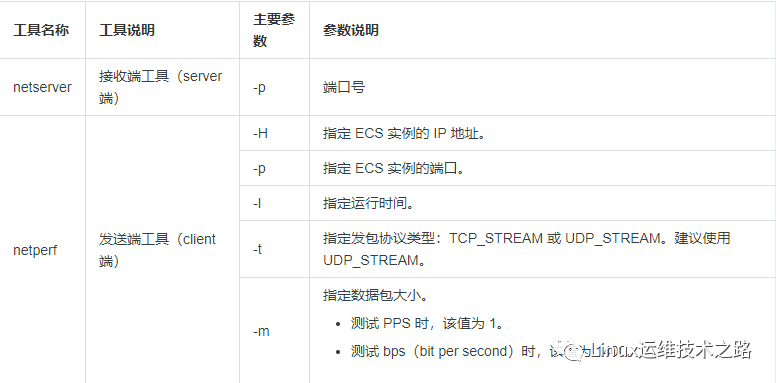 Netperf 安装完成后,会生成 2 个工具:netserver 和 netperf。以下为 2 个工具的主要参数。