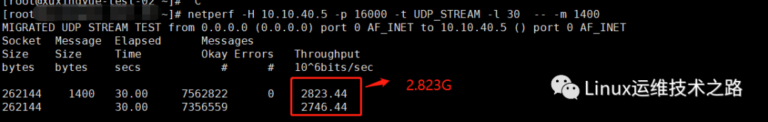 客户端:netperf -H 10.10.40.5 -p 16000 -t UDP_STREAM -l 30 -- -m 1400