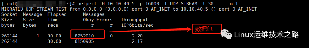客户端 netperf -H 10.10.40.5 -p 16000 -t UDP_STREAM -l 30 -- -m 1