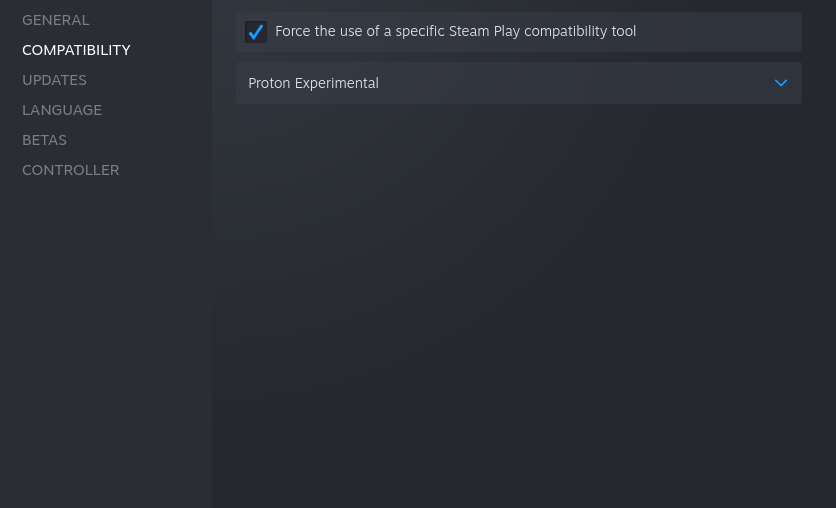 这可以通过右键点击游戏并选择“属性”来完成。然后在“兼容性”下,你需要勾选“强制使用特定的 Steam Play 兼容工具”复选框。接下来,从下拉菜单中选择 “Proton Experimental”。