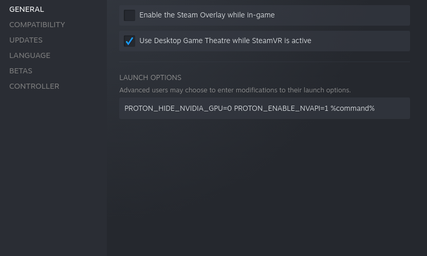 最后,你需要在“启动选项”中插入命令:PROTON_HIDE_NVIDIA_GPU=0 PROTON_ENABLE_NVAPI=1 %command%