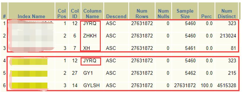 下图上面是正常执行计划使用的高效索引,sql用到了索引的全部3个字段;下面是性能故障时执行计划使用的低效索引,sql只用到了JYRQ(number类型保存日期数据)一个字段: