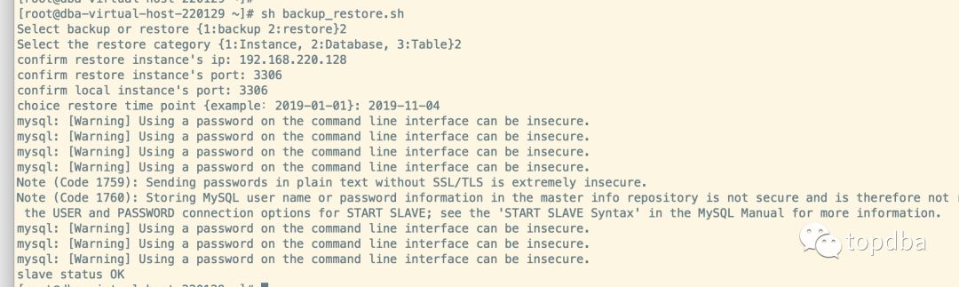 $MYSQL -uroot -proot -S data/mysqldata/mysql3306/sock/mysql.sock -e "CHANGE MASTER TO MASTER_HOST='$RESTOREIP',MASTER_USER='replic',master_port="$RESTOREPORT",MASTER_PASSWORD='replic@hot',MASTER_LOG_FILE='$MASTER_BINLOG_FILE',MASTER_LOG_POS=$MASTER_LOG_POS;"