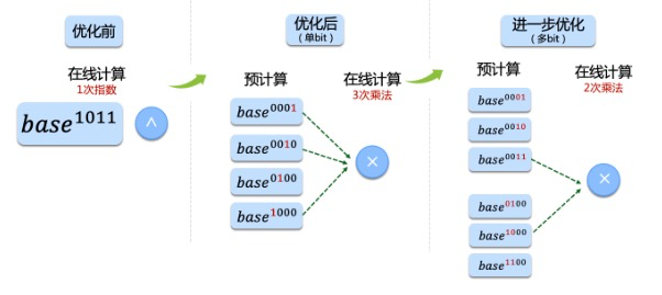 上计算模指数)。对于这种情况,可以使用预计算的方法,提前算好一些指数运算结果并保存,使得在线加解密的模指数计算转化为模乘运算。
