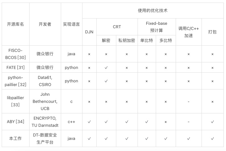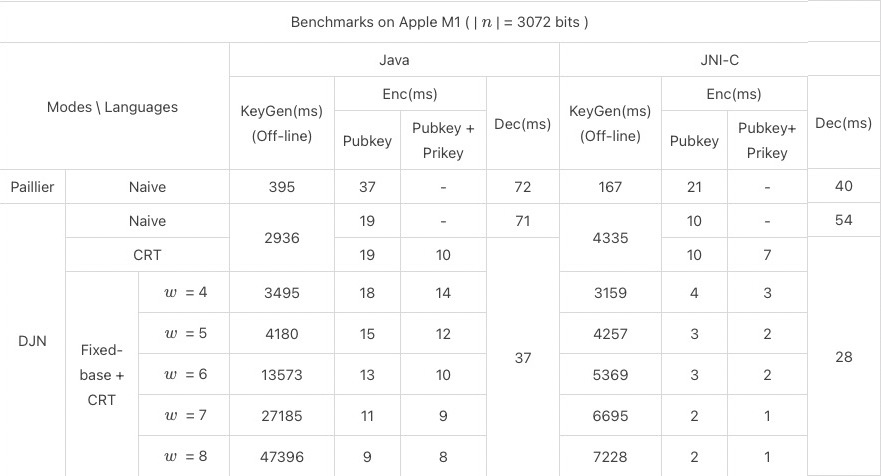 的预计算List开销。当w设置得越大,在线的模指数计算越快,同时需要预先生成并传输、存储的预计算List也越大。 具体的性能提升结果见表4.2,预计算List的大小随w的变化见表4.3。窗口大小w需要根据场景灵活选择,来获得最佳的性能/通信平衡。在存储空间有限时,可以采用更轻量级的预计算方法来减小存储开销[41][42],在c/c++下预计可以达到一定加速效果。 这里的模乘我们使用Java中的Biginteger.multiply(),模指数使用Biginteger.modpow()。