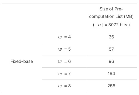 ),并存入列表中。当进行加密解密的模指数运算时,测试指数的每一bit是否为1,使用预计算的列表计算结果。经过此优化,1次模指数转化为|n|/2次(平均)模乘。在Java上,若使用上述按单个bit展开的方法,|n|/2次(|n|=3072)耗时比1次模指数要长,没有达到优化计算的效果。