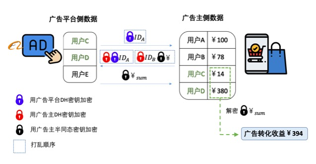 在在线广告投放的场景中,广告主(如商家)在广告平台(如媒体)投放在线广告,并希望计算广告点击的转化收益。然而,广告点击数据集和购买数据集分散在广告主和广告平台两方。使用PHE加密结合隐私集合求和(Private Intersection-Sum-with-Cardinality, PIS-C)协议[19]可以在保护双方隐私数据的前提下,计算出广告的转化率。 该方案已被Google落地应用[20];