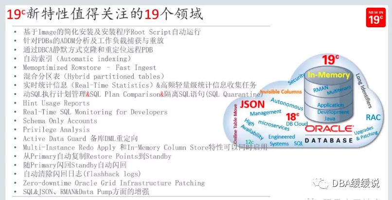 Oracle Database 19c当中,有19个值得关注的领域,这些新特性有助于用户更好地使用Oracle数据库为业务系统提供强有力的数据支持。(见下图)