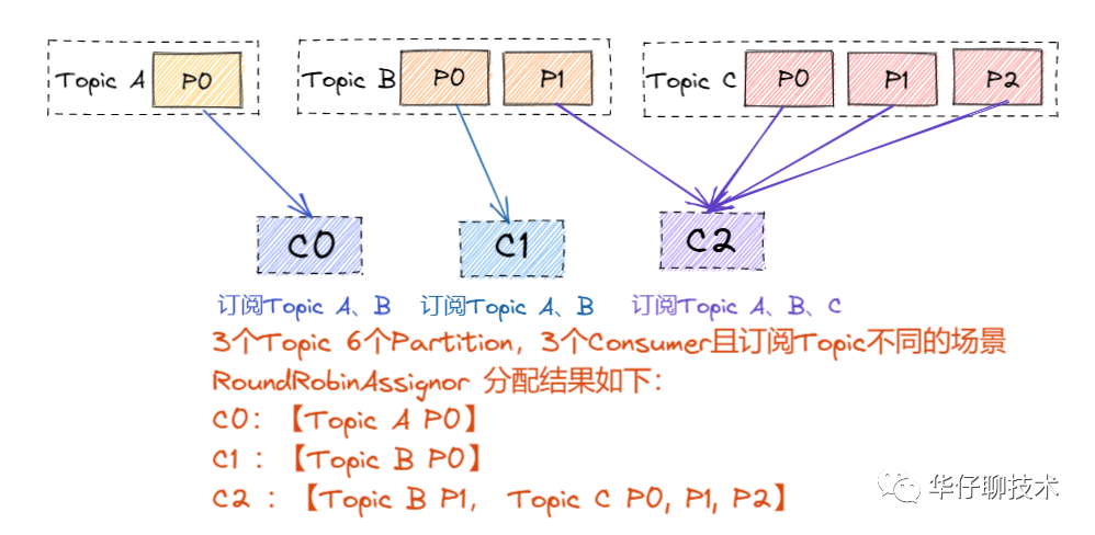RoundRobinAssignor 的分区分配策略是将 Consumer Group 内订阅的所有 Topic 的 Partition 及所有 Consumer 进行排序后按照顺序尽量均衡的一个一个进行分配。如果 Consumer Group 内,每个 Consumer 订阅都订阅了相同的Topic,那么分配结果是均衡的。如果订阅 Topic 是不同的,那么分配结果是不保证“尽量均衡”的,因为某些 Consumer 可能不参与一些 Topic 的分配。