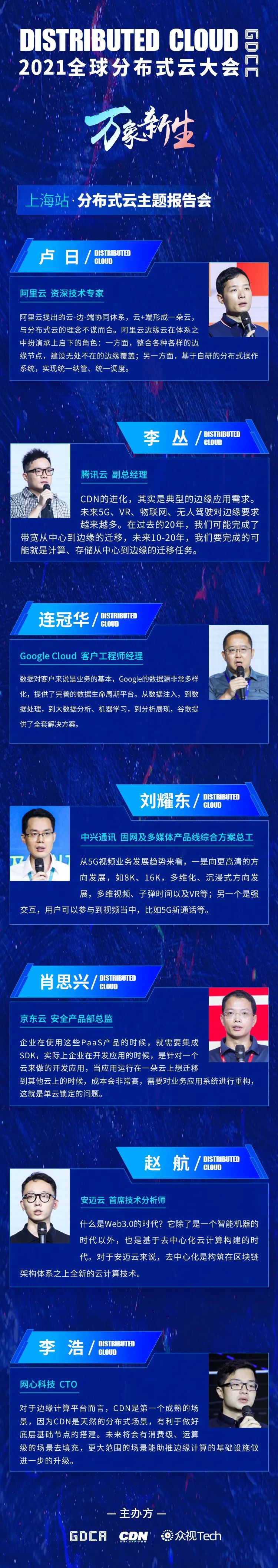 在本次大会的分布式云主题报告会上,来自阿里云、腾讯云、Google Cloud、中兴通讯、京东云、安迈云、网心科技等顶尖分布式云技术企业的嘉宾,分别发表了精彩演讲,从分布式边缘云、CDN分布式架构、分布式云安全、出海加速、Web3.0、边缘平台等多个分布式云细分领域,展示最前沿技术演进。
