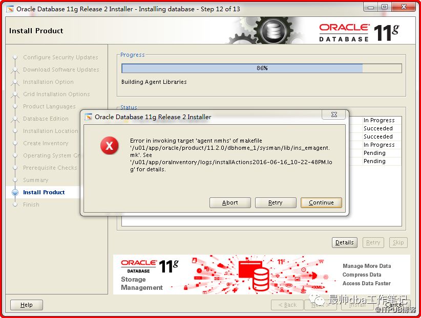 好了废话不多说。今天带来的是一个故障解决,这个可能大家会遇到,所以我说一下。在安装数据库的时候有可能会遇到这个报错,大概在86%的时候。