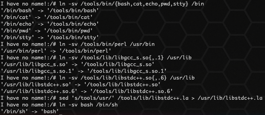 ln -sv /tools/bin/{bash,cat,echo,pwd,stty} /bin ln -sv /tools/bin/perl /usr/bin ln -sv /tools/lib/libgcc_s.so{,.1} /usr/lib ln -sv /tools/lib/libstdc++.so{,.6} /usr/lib sed 's/tools/usr/' /tools/lib/libstdc++.la > /usr/lib/libstdc++.la ln -sv bash /bin/sh