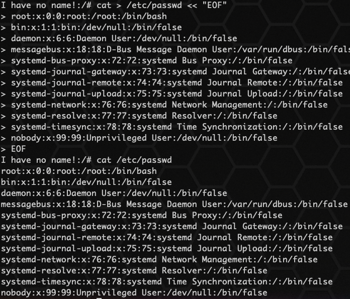 cat > /etc/passwd << "EOF" root:x:0:0:root:/root:/bin/bash bin:x:1:1:bin:/dev/null:/bin/false daemon:x:6:6:Daemon User:/dev/null:/bin/false messagebus:x:18:18:D-Bus Message Daemon User:/var/run/dbus:/bin/false systemd-bus-proxy:x:72:72:systemd Bus Proxy:/:/bin/false systemd-journal-gateway:x:73:73:systemd Journal Gateway:/:/bin/false systemd-journal-remote:x:74:74:systemd Journal Remote:/:/bin/false systemd-journal-upload:x:75:75:systemd Journal Upload:/:/bin/false systemd-network:x:76:76:systemd Network Management:/:/bin/false systemd-resolve:x:77:77:systemd Resolver:/:/bin/false systemd-timesync:x:78:78:systemd Time Synchronization:/:/bin/false nobody:x:99:99:Unprivileged User:/dev/null:/bin/false EOF