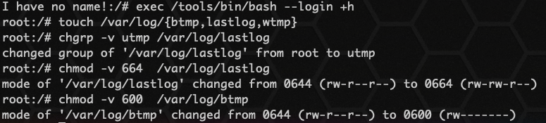 touch /var/log/{btmp,lastlog,wtmp} chgrp -v utmp /var/log/lastlog chmod -v 664 /var/log/lastlog chmod -v 600 /var/log/btmp
