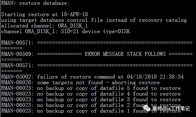 在做备份恢复实验的时候将oradata的所有文件全部删除,通过恢复控制文件,数据库开启到mount状态下,发现restore database甩出了一个报错。找不到对应的备份文件。
