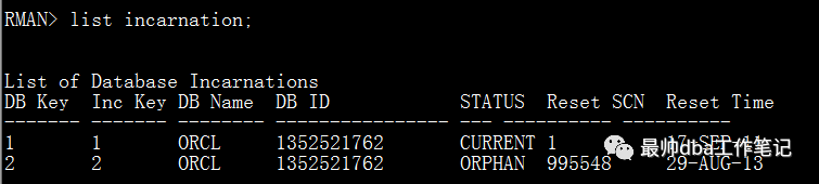 首先数据库做过一次全备,备份过后的数据文件是存在的,并且第一次恢复数据库,没有进行resetlog的操作,只有两个incarnation。