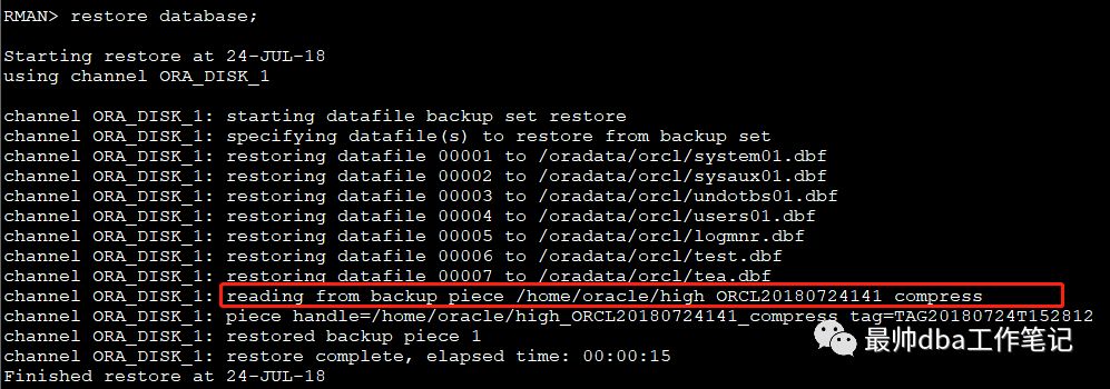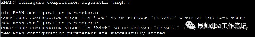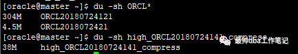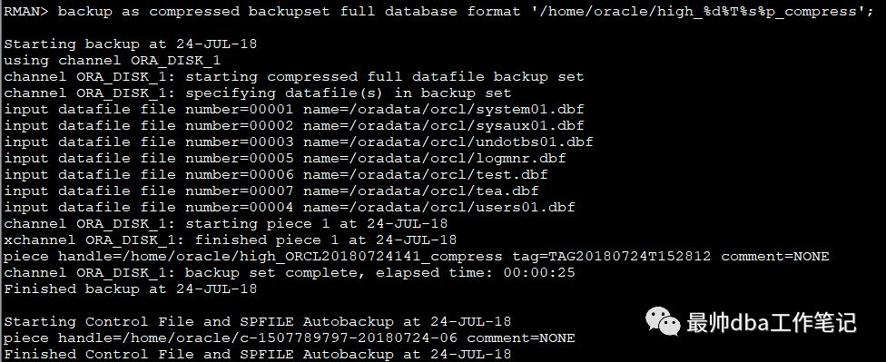 压缩的时候使用backup as compressed backupset full database format '/home/oracle/high_%d%T%s%p_compress';