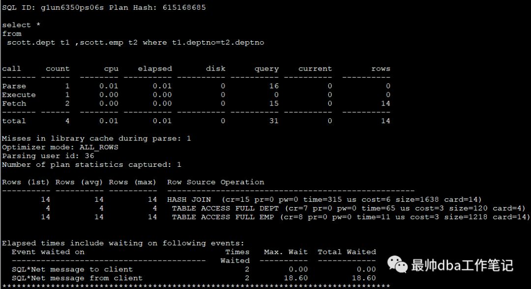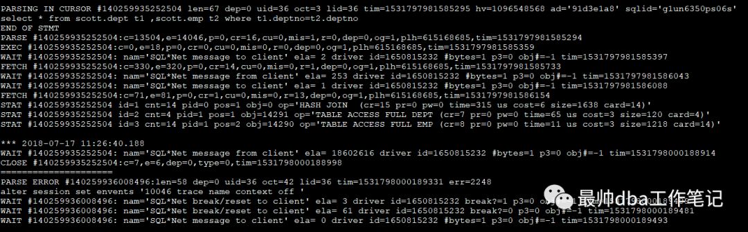 昨天的文章当中我们说了说如何产生执行计划几种手段,包括set autotrace explan plan for dbms_xplan.display / awrsqrpt.sql / hint (/*+ gather_plan_statistic */ ),其实还有一种方法我没有说到,就是ora-10046。我觉得这个应该单独放出来说一下。我在之前一直不知道这个玩意有啥用,因为确实是经验不足,用到的特别少,而且我觉得用起来不是特别方便,而且有可能导致数据库在做10046的时候性能直线下降。但是这个工具确实可以直接了当的定位到数据库的一些性能问题上,说实话是dba的一个必备的工具。而且,在《ORACLE工作笔记这本书当中》杨建荣老师酷爱使用这个去分析数据库性能表现。下面我们就说一说10046。