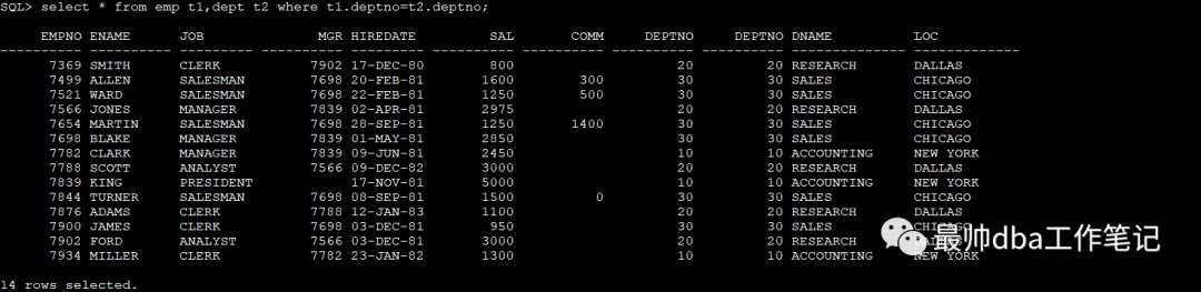 select * from dept t1,emp t1 where t1.deptno=t2.deptno;