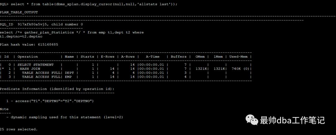 select *+ gather_plan_statistics */ * from dept t1,emp t2 where t1.deptno=t2.deptno;