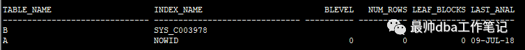 select table_name,index_name,blevel,num_rows,leaf_blocks,last_analyze from user_index;