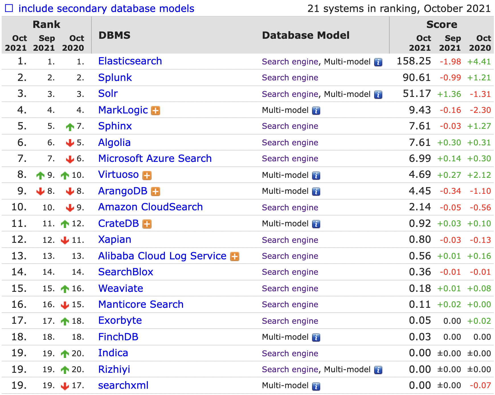 以下是 DB-Engines 网站上的搜索殷勤数据库列表: