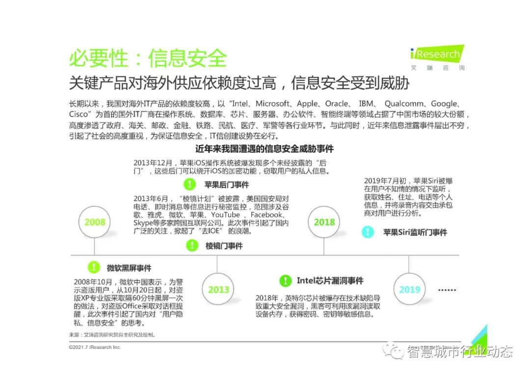 信创不单是全球信息安全事件频发、中西摩擦加剧的伴生概念,更是我国IT供应链寻求产业升级的实现手段。早在20世纪80年代,我国政府对IT底层基础软硬件的自主创新就提出了相关要求,但由于信息基础软硬件的关键技术及标准被国外IT巨头垄断,诸多系统性风险与安全隐患无力解决。