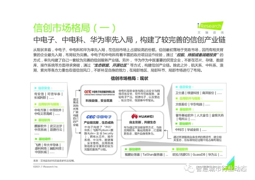 从现状来看,中电子、中电科和华为率先入局,在信创市场上占据较高的份额。信创最初落地于党政市场,因而有相关背景的企业最先入局,布局较为完善。中电子和中电科有着丰富的政府项目运作经验,通过“控股、持股或者战略投资”的方式,率先构建了自己一套较为完善的信创服务产业链。另外, 华为作为中国重要的民营企业,不断在芯片、存储、数据库、操作系统等方面寻求突破,通过“生态联盟、开源社区”等方式,构建信创产业链。除此之外,航天系、中科系、浪潮、紫光等各方力量也在借信创风口,不断补足自身的能力,在局部地区、局部环节、局部市场进行了布局。