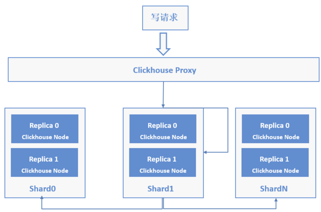 对于分布式运行的方式,数据写入时ClickHouse proxy会先选择其中一个节点作为为初始节点,由该初始节点根据写入请求拆分为多个子请求转发给对应的节点并进行数据写入,集群的写入流程大概如下图所示:
