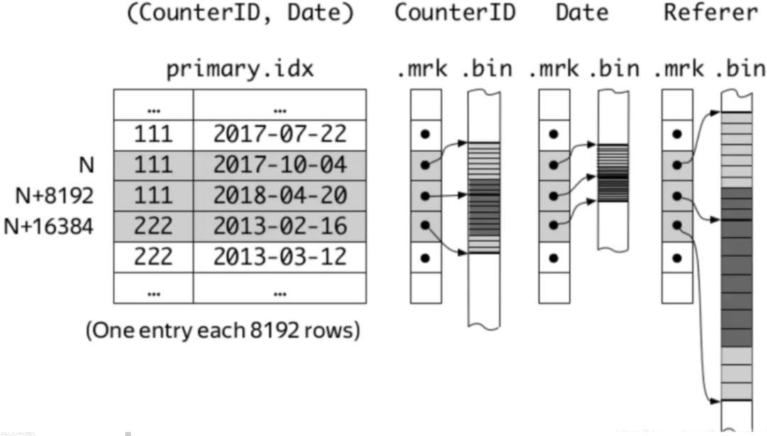 ClickHouse采用的是稀疏索引,将每列数据按照 index granularity(默认8192行)进行划分。稀疏索引的好处是条目相对稠密索引较少,能够将其加载到内存,而且对插入时建立索引的成本相对较小。ClickHouse 数据按列进行存储,每一列都有对应的 mrk 标记文件,bin 文件。mrk 文件与主键索引对齐,主要用于记录数据在 bin 文件中的偏移量信息。查询时通过对主键索引进行二分查找,定位到对应的 mrk 标记文件,进而找到对应的 bin 文件的偏移量,最终扫描得到相应的数据,避免了全表扫描,从而加速查询。索引结构大致如下图所示:
