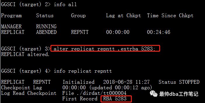 这个时候我们观察进程的状态,我们会发现target端的replicat进程会因此ABENDED,我们多次启动,仍然是ABENDED,现在的问题就是我这个报错卡在这过不去了,当然我要是删掉target端的test.test表再启动,肯定是可以起来的,但是在生产上,如果我的表现在就是有数据的,我这部分数据还不能丢,那这个情况我们就不能再使用删表的这种方法了。