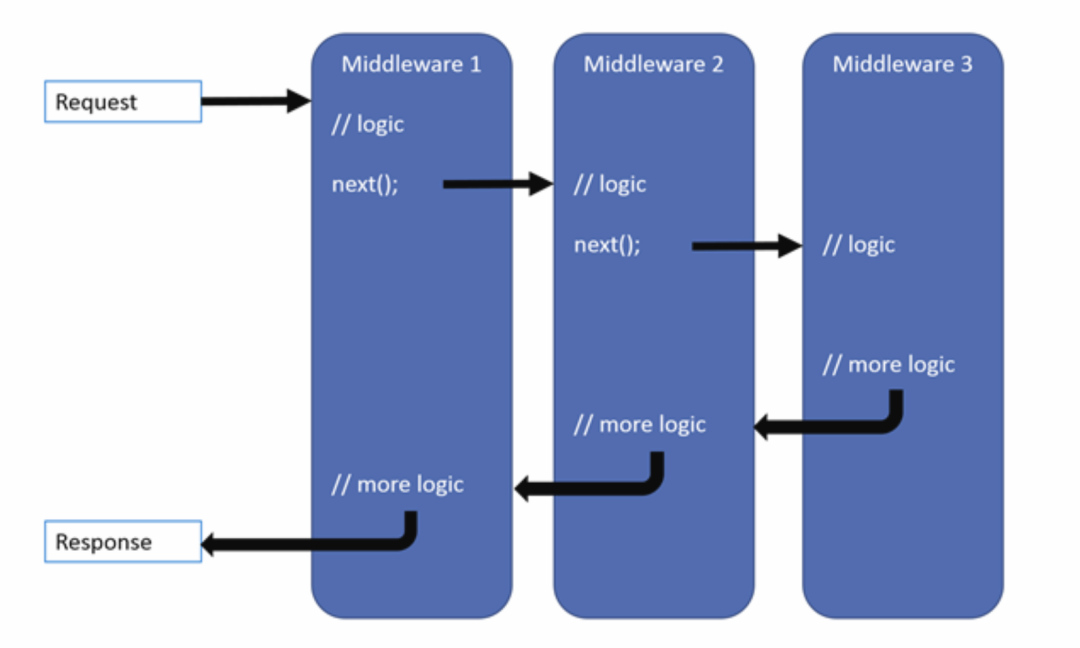 中间件是组装到应用程序管道中以处理请求和响应的软件。每个组件: