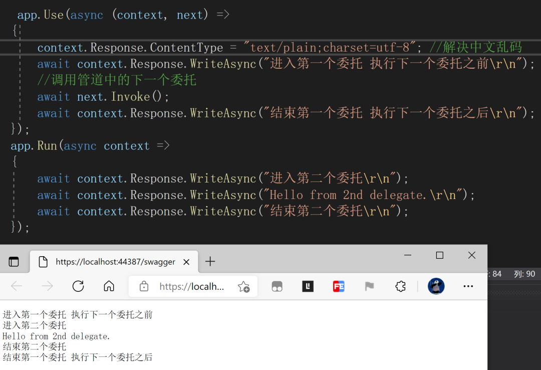 请求委托使用Run,Map和Use扩展方法进行配置。单独的请求委托可以以内联匿名方法(称为内联中间件)指定,或者可以在可重用的类中定义它。这些可重用的类和内联匿名方法是中间件或中间件组件。请求流程中的每个中间件组件都负责调用流水线中的下一个组件,如果适当,则负责链接短路。