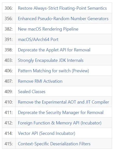 JDK/Java 17 总共包含 14 个 JEP,具体如下: