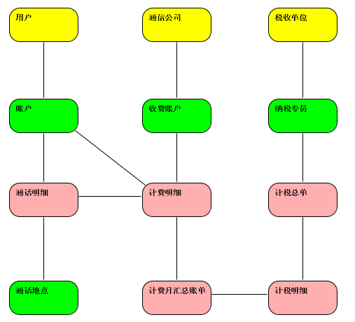 在明确本次建模的重心是计费和计税两个模块后,我们开始运用四色建模法进行领域分析。相关四色建模法资料可以参见以下链接:http://www.infoq.com/cn/articles/xh-four-color-modeling