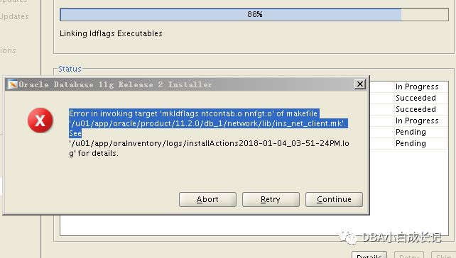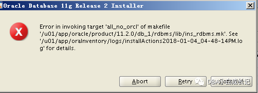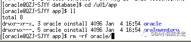经百度发现是因为缺少32位的安装包,只能一个个下载,rpm -ivh进行安装,顺便要说下的是因为是用oracle用户打开图形界面的,所以这个时候安装包并不能传到linux服务器,只能先点击“Abort”退出这个过程,并手动去/u01/app下删除新生成的2个文件夹,如下: