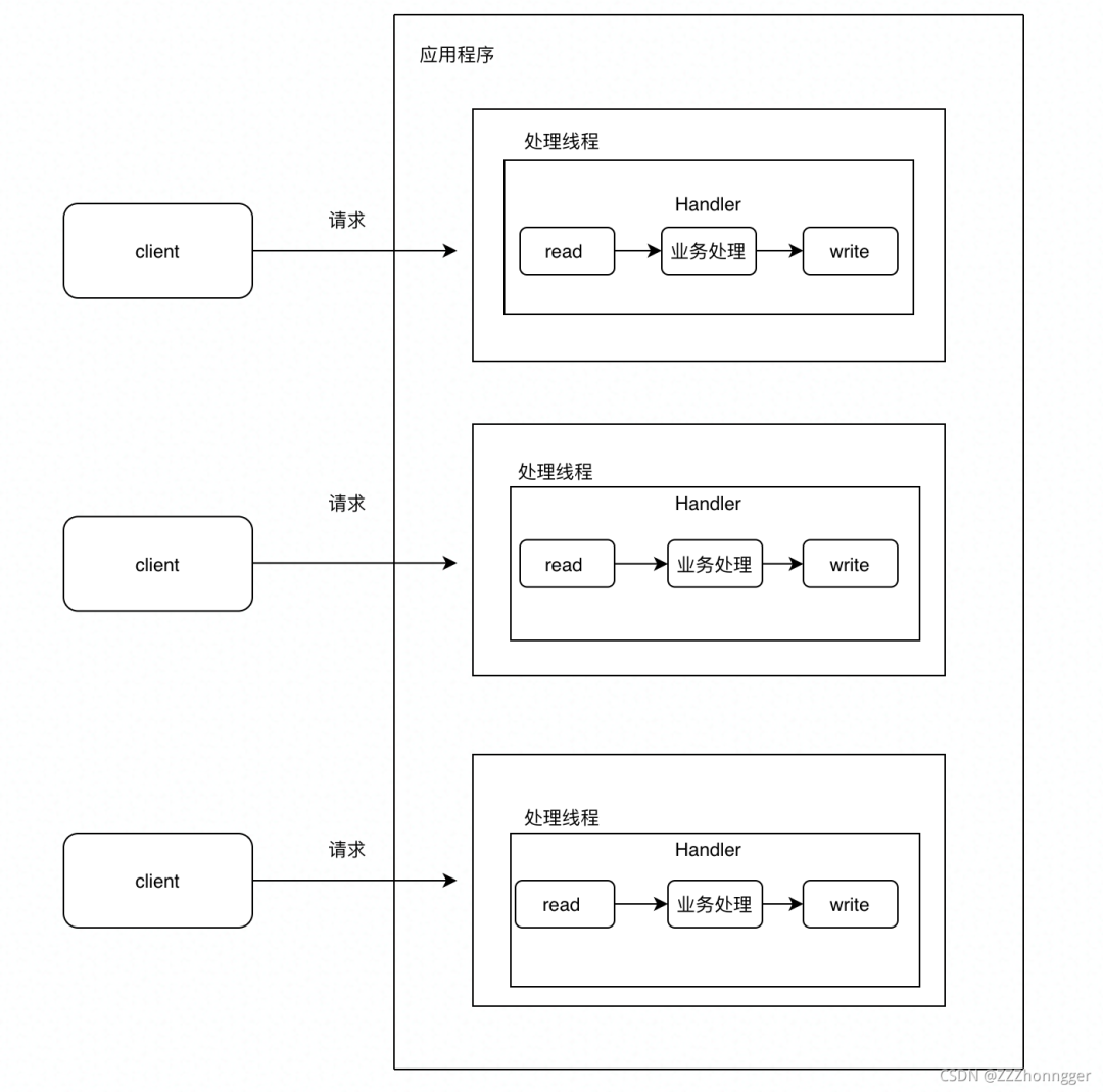 每个连接都要独立的线程来完成数据的输入、业务处理、数据的输出返回