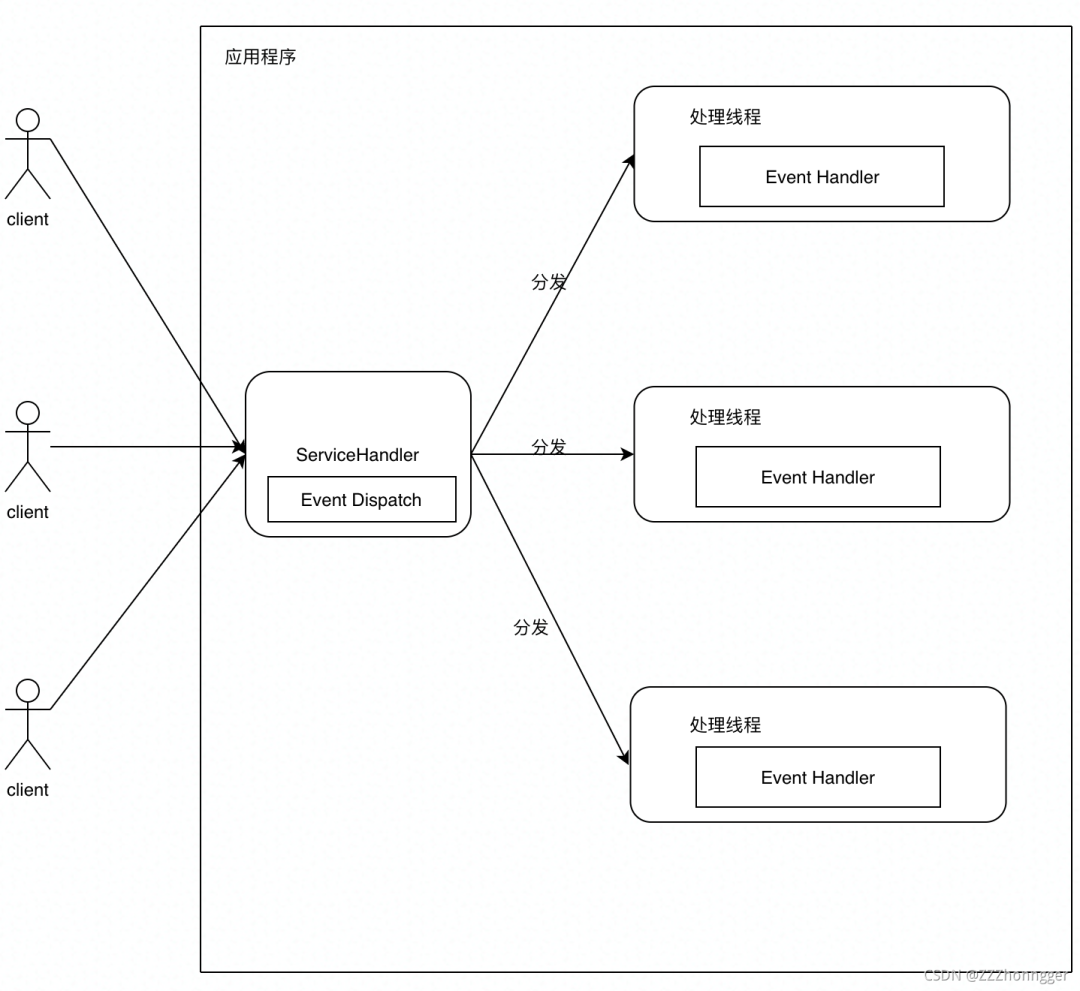 Reactor主线程MainReactor对象通过select监听连接事件,收到连接事件后,则交给一个特定的线程处理连接后的业务;如果是其他事件,MainReactor会将事件分配给从线程的SubReactor对象,然后SubReactor将事件分发到不同的Handler,但Handler只负责相应事件,不做具体的业务处理,只是通过read读取数据后,交给worker线程池进行处理业务,worker线程池会分配一个线程来处理业务,并将结果返回给Handler,Handler再返回结果给客户端。