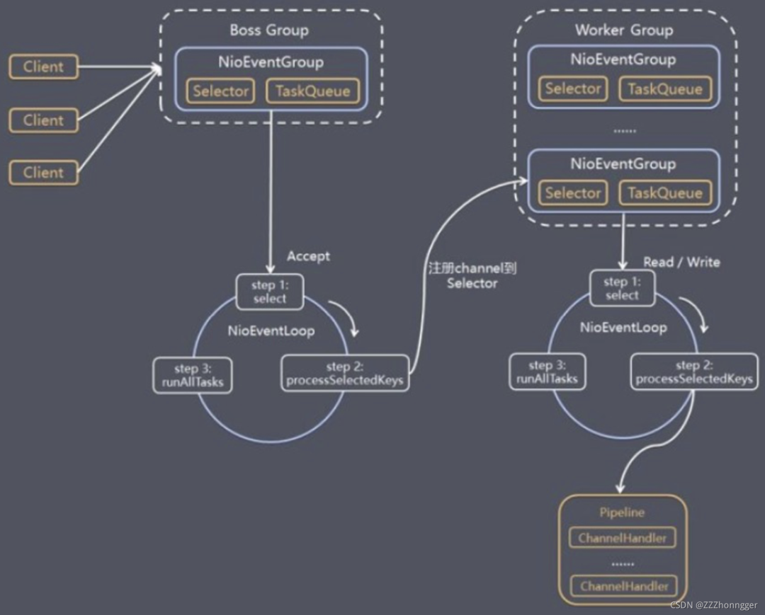 Netty 抽象出两组线程池:BossGroup 和 WorkerGroup,也可以叫做 BossNioEventLoopGroup 和 WorkerNioEventLoopGroup。每个线程池中都有 NioEventLoop 线程。BossGroup 中的线程专门负责和客户端建立连接,WorkerGroup 中的线程专门负责处理连接上的读写。BossGroup 和 WorkerGroup 的类型都是 NioEventLoopGroup。