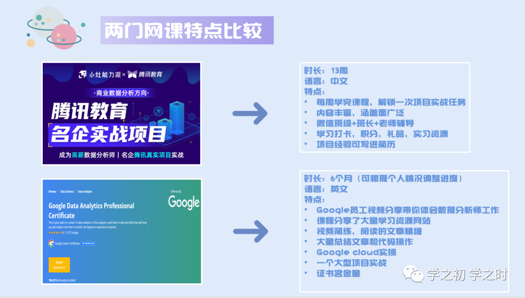 就时长而言,其实关注点不在这里,最好是把关注点放在课程结构和内容上。我列出了两门课的特色,也算是给大家在