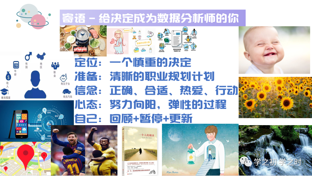 最后,是我对大家的寄语,如果你对数据分析开始有了兴趣,想要尝试,或者你已经决定了,那么我希望这5个词能帮助到你:定位、准备、信念、心态、自己。