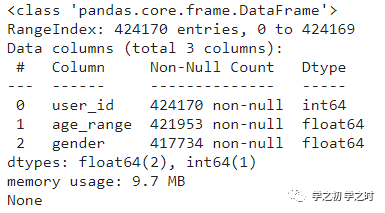 (如图1)我们可以看到该数据集一共有424170行样本,其中3个变量的数据类型都是数值型变量,age_range和gender包含缺失值。
