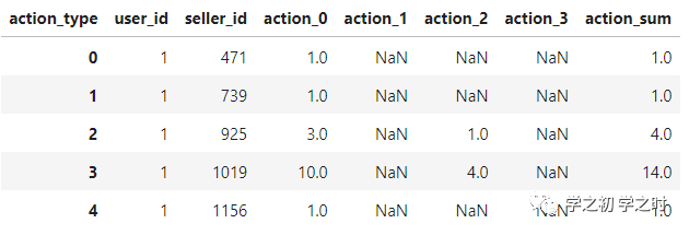 #针对user_log_data统计各交互类型次数#行转列user_log_tmp= user_log_data.groupby(['user_id','seller_id'])['action_type'].value_counts().unstack()#添加求和列user_log_tmp['sum']= user_log_tmp.sum(axis= 1)#在所有列名前加一个“action"#reset_index()重置索引user_log_tmp= user_log_tmp.rename(columns=lambda x:f'action_{x}').reset_index()