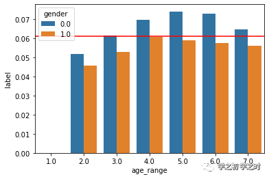 sns.barplot(x= 'age_range', y= 'label',hue= 'gender', data= age_gender)plt.axhline(y=df_final['label'].mean(),c='red')#红线为大盘的平均复购率